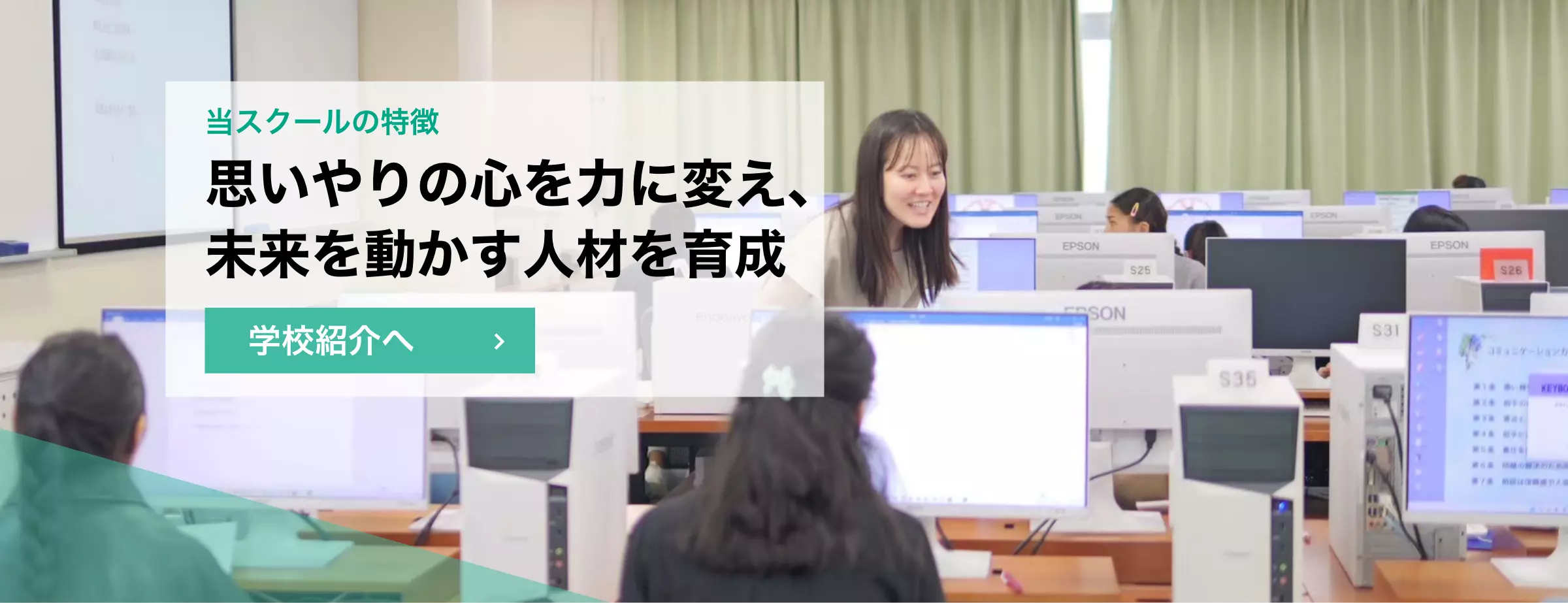 本校は、創立以来「実学の精神」を大切にし、社会で役立つ専門知識とスキルを身につける教育を行っています。情報・AIを専攻して実践ビジネスで利用できる教育分野、病院事務やソーシャルワーカーとなる社会福祉士・精神保健福祉士養成する医療福祉教育分野、さらにはコンテンツビジネスを専攻する国際コミュニティ教育分野まで幅広く学べます。各分野のプロが、将来プロとして活躍したい皆さんを力強くサポートしていきます。